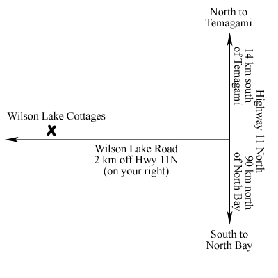 Hwy 11, 91 km north of North Bay. turn left at Wilson Lake